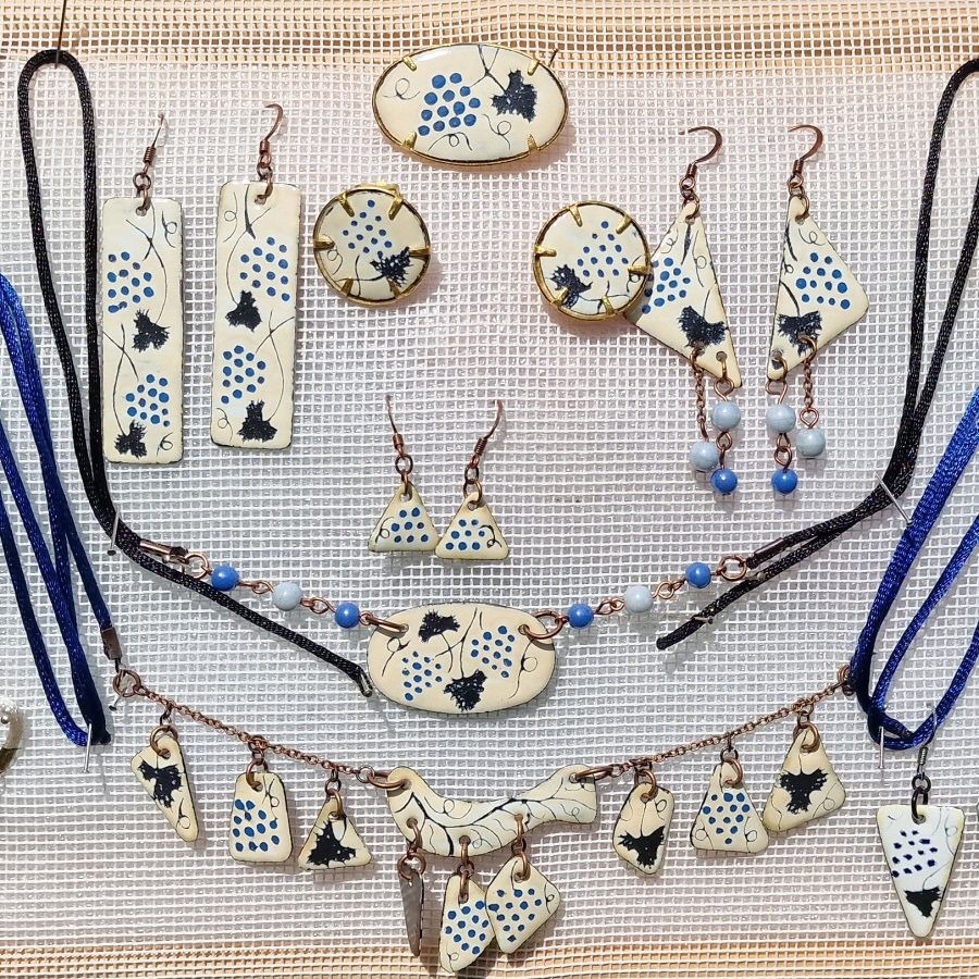 Moje nová kolekce je inspirovaná stylizovanou kresbou na souborových krojích. V nabídce je mnoho různých tvarů a velikostí náušnic, přívěsků, náhrdelníků a dalších šperků a doplňků. Liší se od sebe především odstínem podkladu (od čistě bílé po režnou) a hroznů.