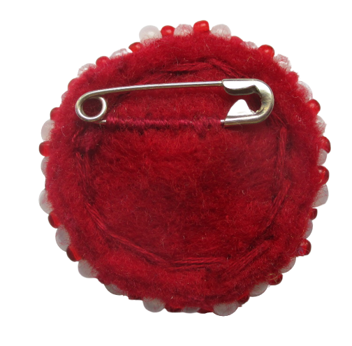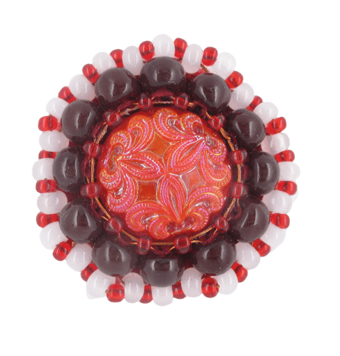 Červenohnědá korálková brož. Brož vyrobená z červeného jabloneckého knoflíku, který je opletený pomocí měděného drátku a korálků v červené, hnědé a bílé barvě. Je podšitá červenou plstí. Ze spodní strany je přišitý špendlík ve stříbrné barvě.