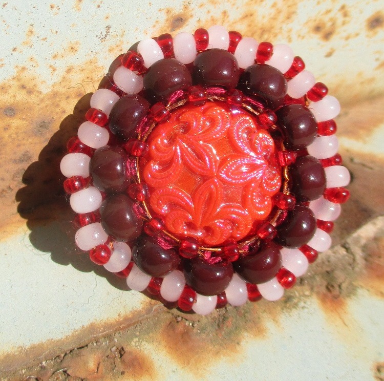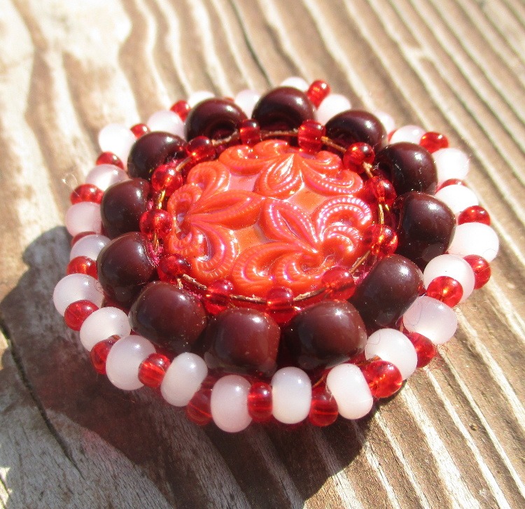 Červenohnědá korálková brož. Třpytivý středový jablonecký knoflík bude dobře ladit s Vašimi perlovými či perleťovými šperky.