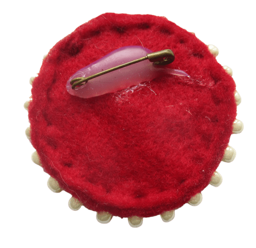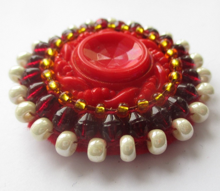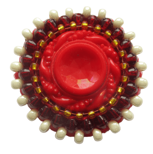 Červená korálková brož s jabloneckým vintage knoflíkem. Hodí se na klopu sáčka nebo kabátu.
