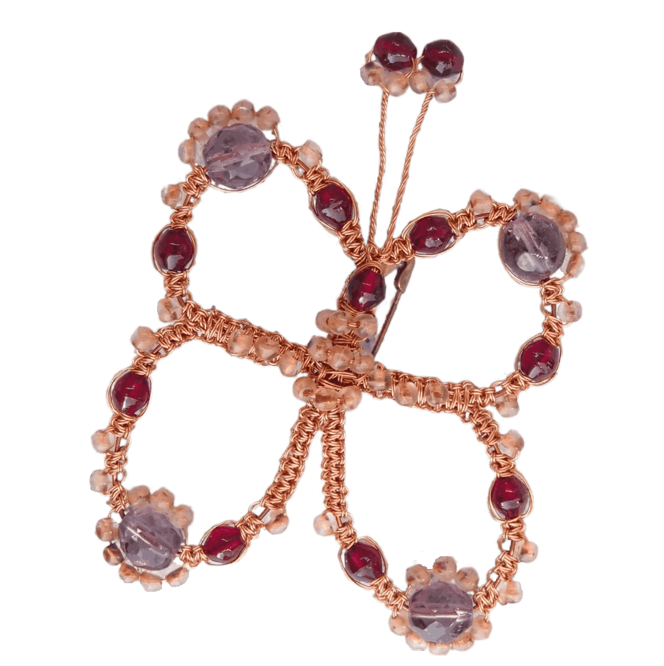 Drátkovaná motýlí brož s velkými fialovými korálky