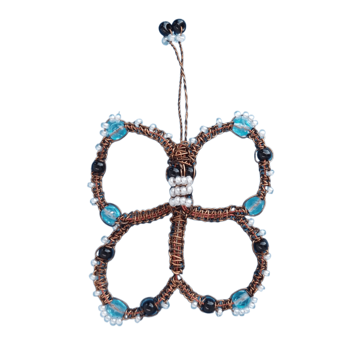 Drátkovaná motýlí brož s velkými modrými korálky
