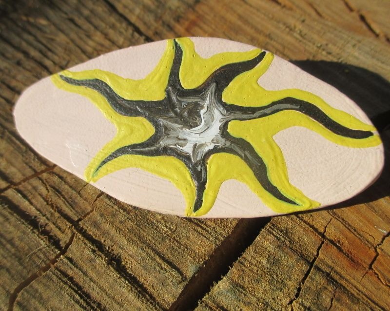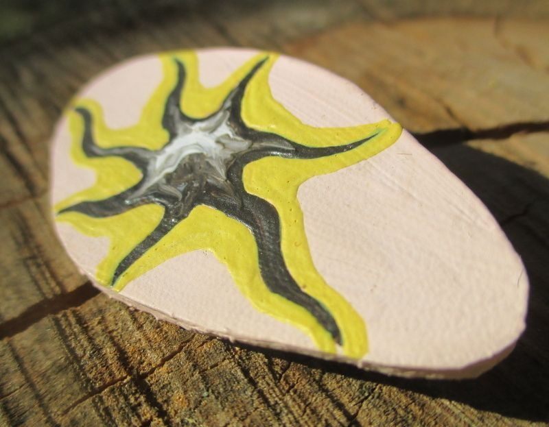 Brož s hvězdou. Brož ve tvaru nepravidelného obdélníku s kresbou hvězdy vystřižená z kůže a malovaná béžovou, hnědou, žlutou a bílou akrylovou barvou. Ze spodní strany je pomocí průhledného plastu připevněný brožový můstek stříbrné barvy.