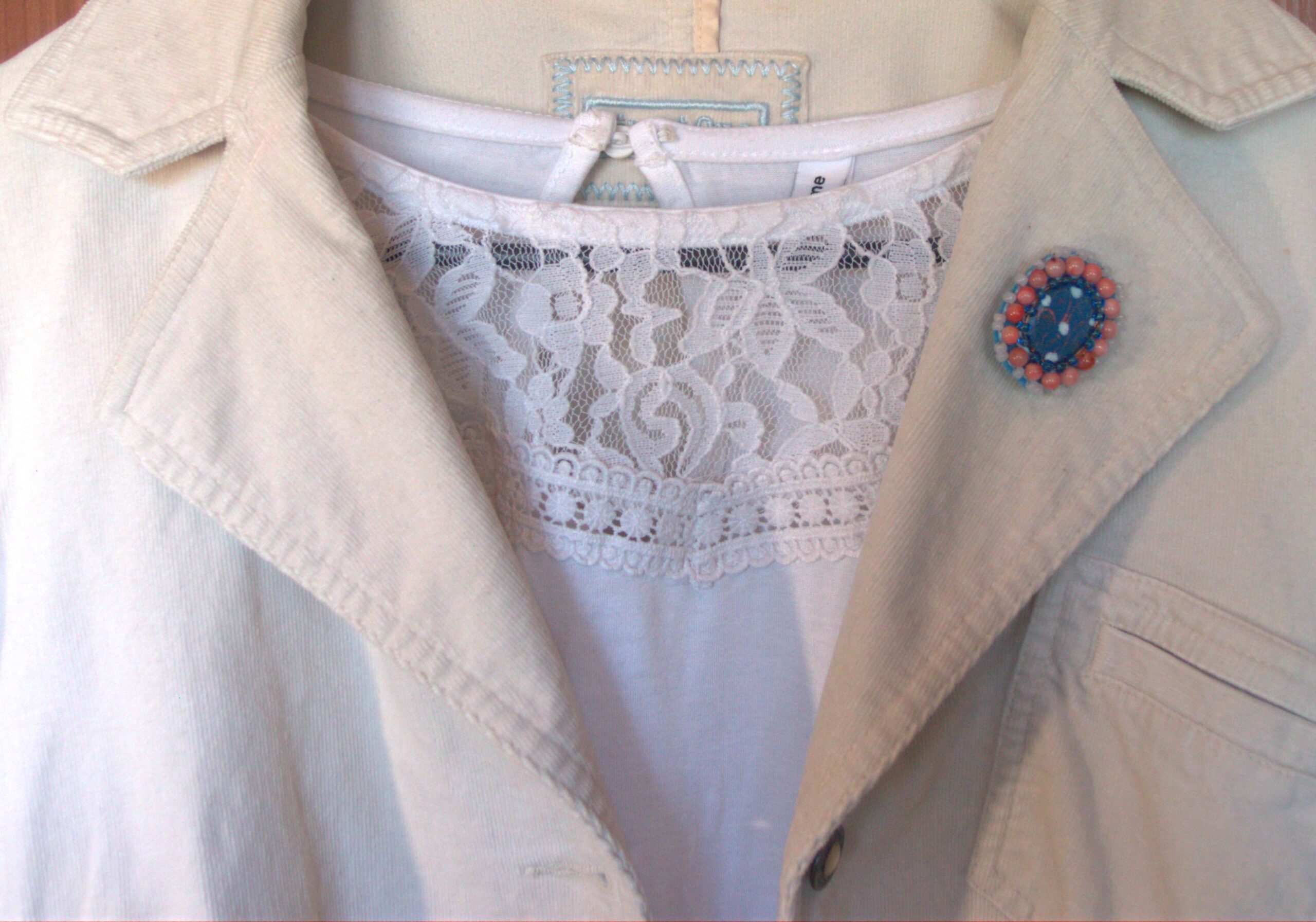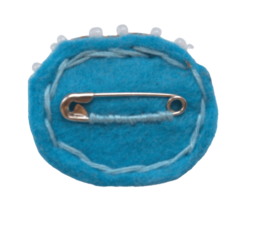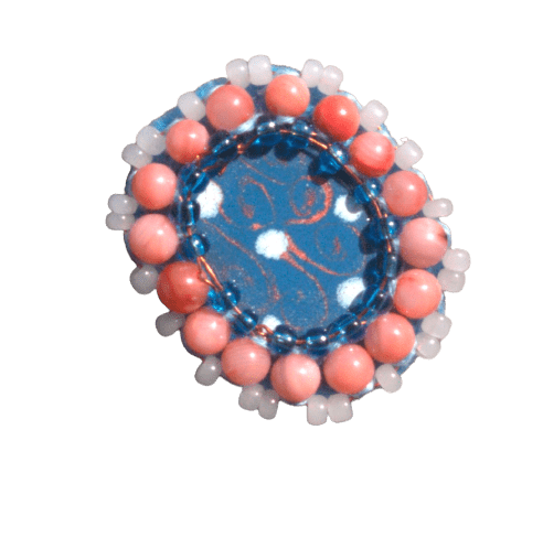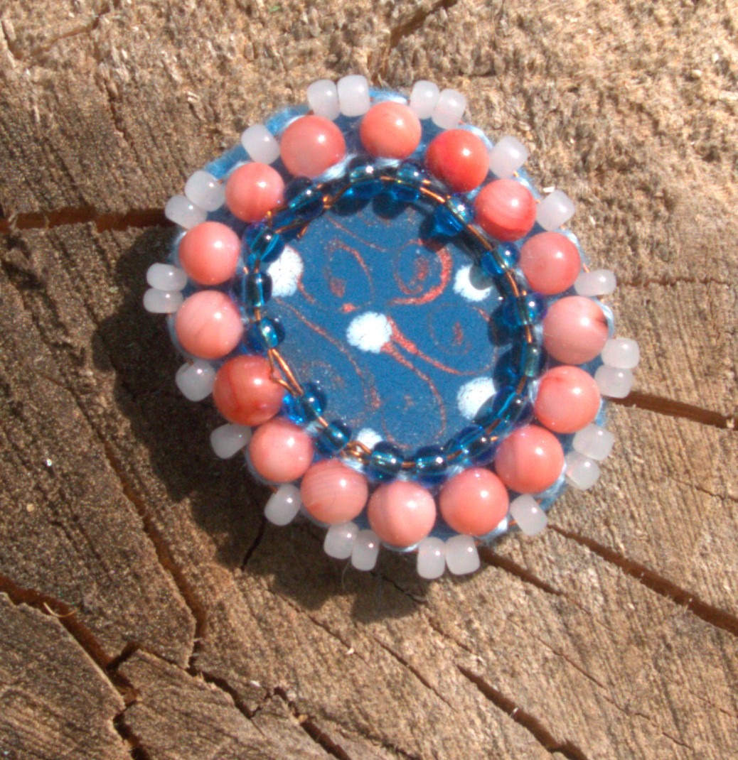 Modrá smaltovaná brož. Smaltovaný plíšek obdélníkového tvaru s růžovými spirálkami a bílými puntíky na modrém podkladu na ručně opracovaném nerezovém plíšku opletený modrými, bílými a růžovými skleněnými korálky. Je podšitá plstí modré barvy se špendlíkem stříbrné barvy.