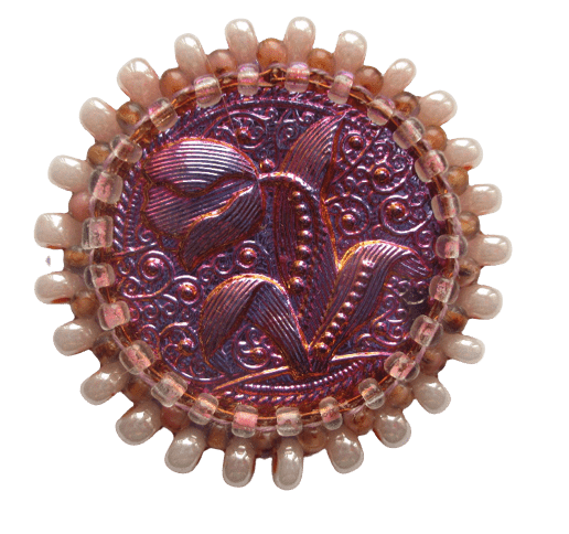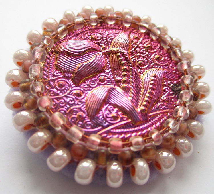 Růžová korálková brož s jabloneckým knoflíkem. Hodí se k romantickým outfitům. Můžete ji připnout na klopu sáčka nebo kabátku.