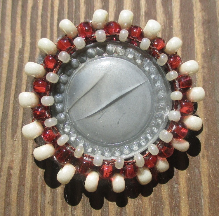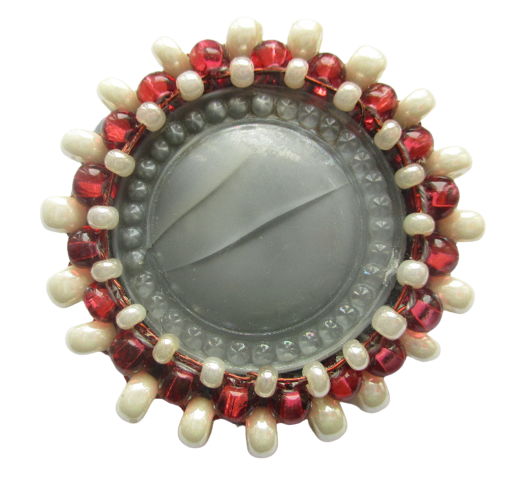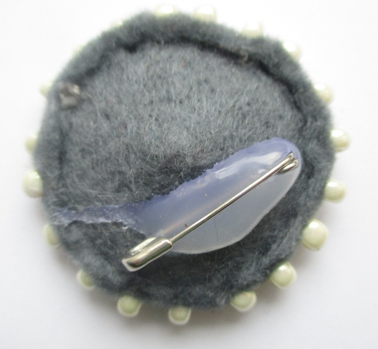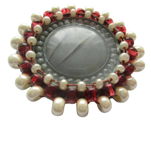 Šedobéžová korálková brož. Elegantní kousek se hodí na klopu saka či svetřík. Využijete ji pro slavnostnější příležitosti. Střed tvoří vintage jablonecký knoflík. Bude ladit k Vašim korálkovým nebo perlovým náušnicím.