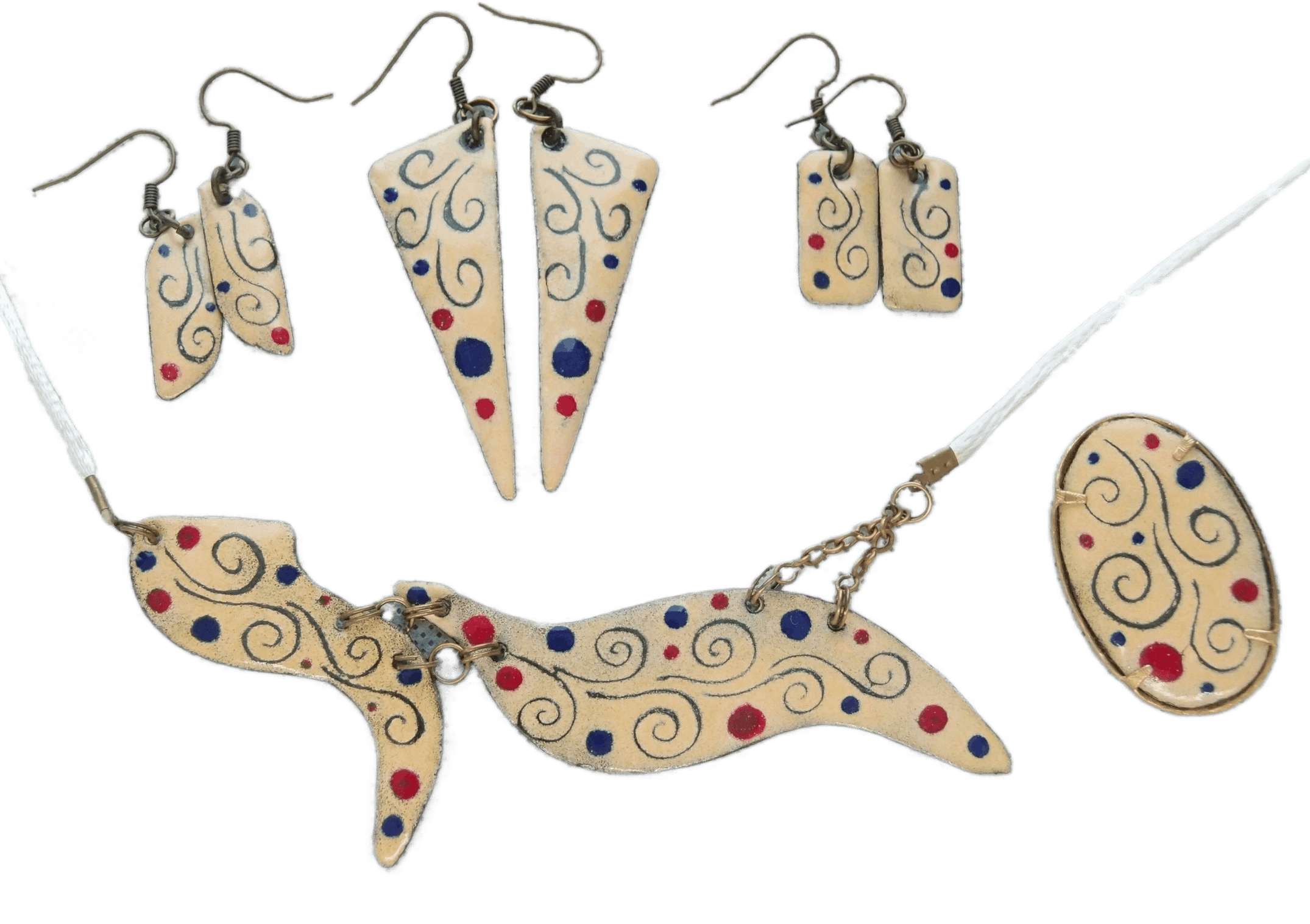 Smaltovaná béžová souprava s puntíky – nadčasová kolekce s náhrdelníkem, broží a náušnicemi ve třech velikostech pro variabilní styling a vintage eleganci.