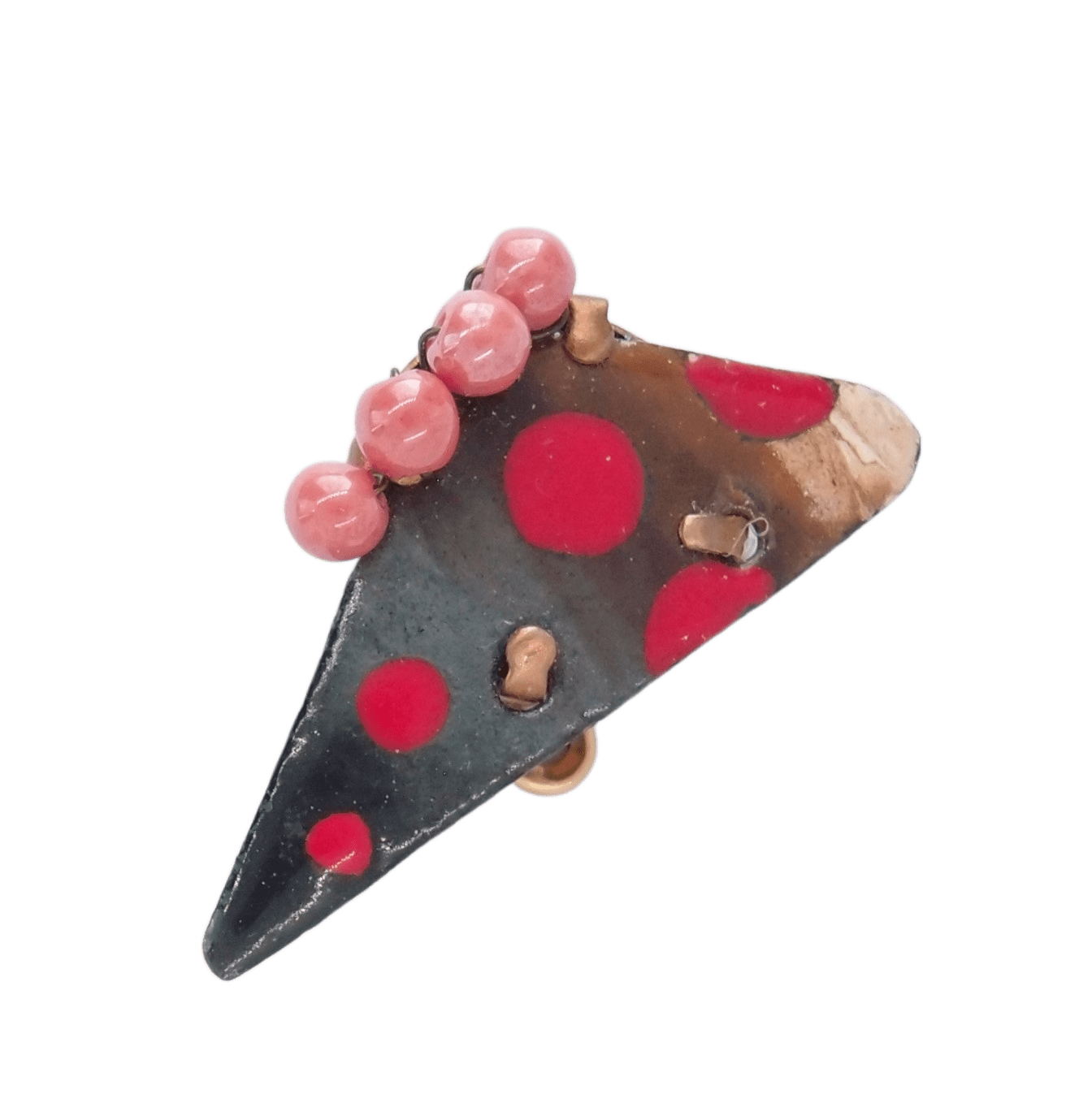 Smaltovaná brož s červenými puntíky. Tato originální smaltovaná brož v čokoládových odstínech s červenými puntíky zaujme jedinečným tvarem a plastickým efektem, který vytvářejí z boku vsazené korálky. Je ideálním doplňkem k minimalistickým outfitům, kde dokonale vynikne její detailní zpracování. Brož lze sladit s náhrdelníkem nebo náušnicemi ze stejné soupravy a vytvořit tak harmonický celek. Skvělá volba pro ženy, které ocení originalitu a osobitý styl.