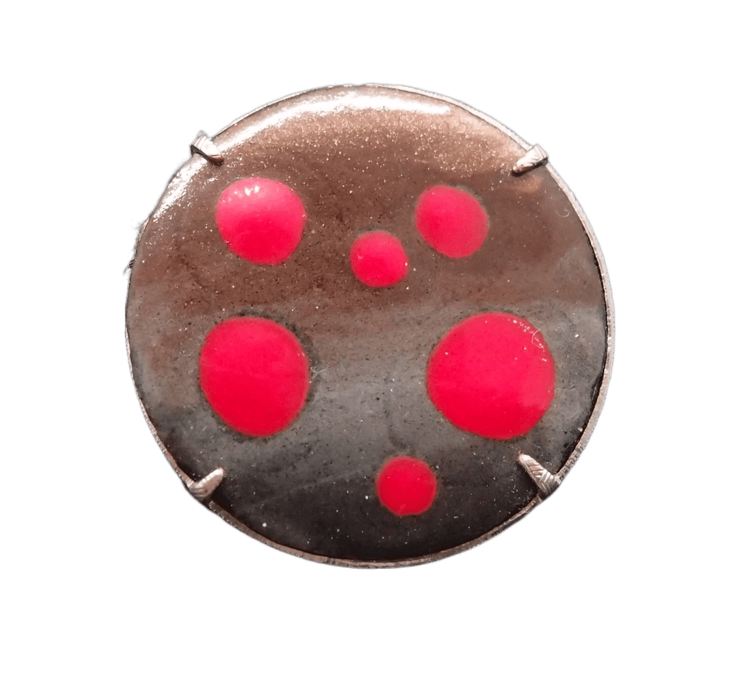 Smaltovaná brož s červenými puntíky. Tato elegantní smaltovaná brož v čokoládových odstínech s jemnými červenými puntíky je stylovým doplňkem pro různé příležitosti. Skvěle vynikne na saku, šatech nebo jiném oblíbeném outfitu, a to jak při formálních událostech, tak v běžném denním stylu. Brož je součástí designové soupravy a krásně ladí s náhrdelníkem, náušnicemi nebo sponkou ze stejné kolekce. Nadčasový kousek, který podtrhne váš osobitý styl.