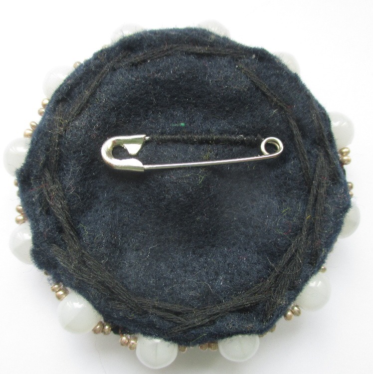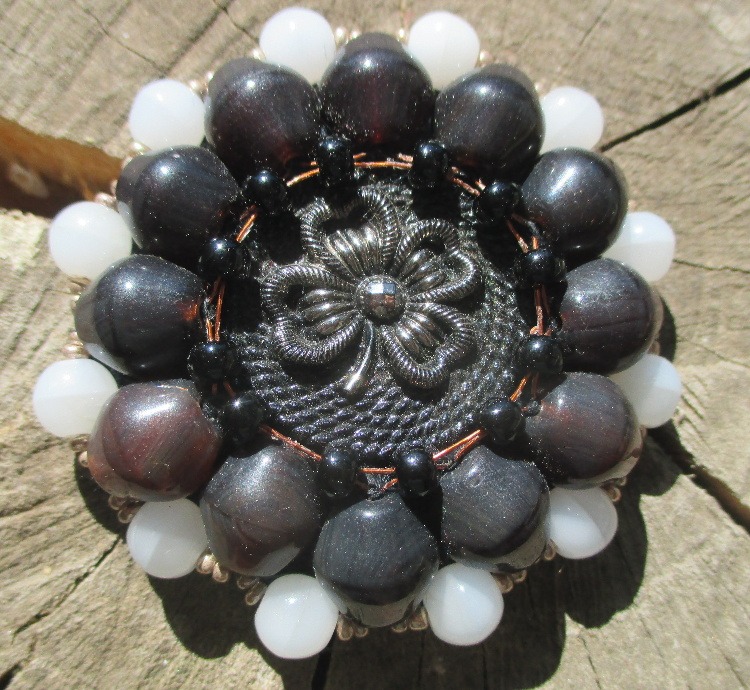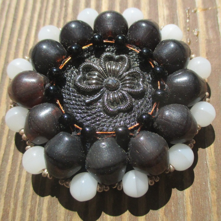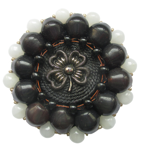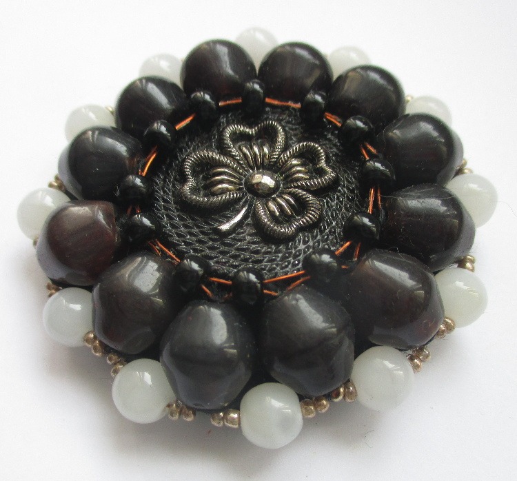Velká korálková brož. Brož vyrobená z černého jabloneckého knoflíku se stříbrným reliéfem květiny, který je opletený pomocí měděného drátku a korálků v černé a tmavohnědé a bílé barvě. Je podšitá černou plstí. Ze spodní strany je přišitý špendlík ve stříbrné barvě.
