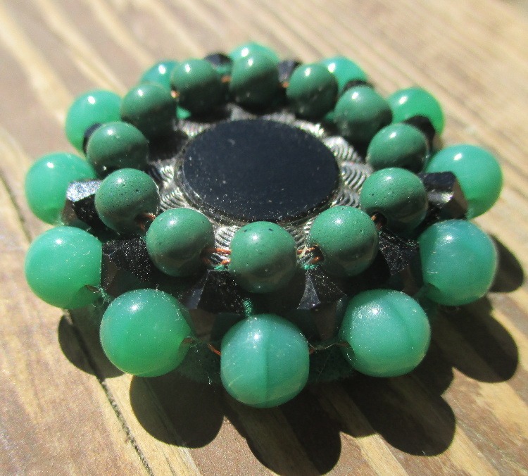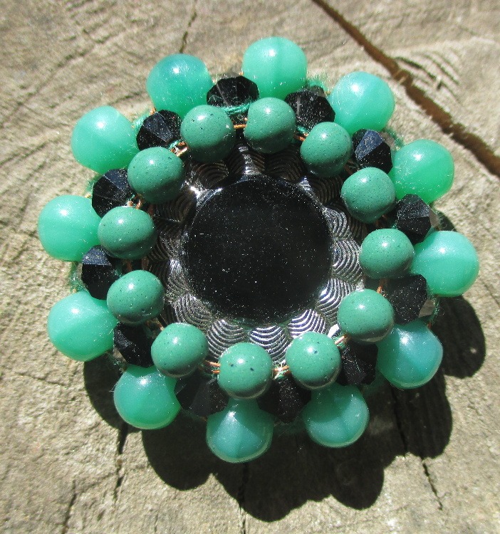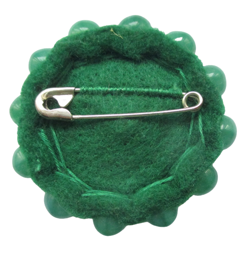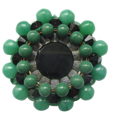 Zelenočerná korálková brož. Brož vyrobená z černého jabloneckého knoflíku se stříbrným okrajem, který je opletený pomocí měděného drátku a korálků v černé a zelené barvě. Je podšitá zelenou plstí. Ze spodní strany je přišitý špendlík ve stříbrné barvě.