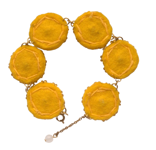 Žlutý korálkový náramek. Hodí se k rozevlátým letním outfitům i elegantnímu stylu. Dolaďte jej náušnicemi či broží ze stejných korálků.