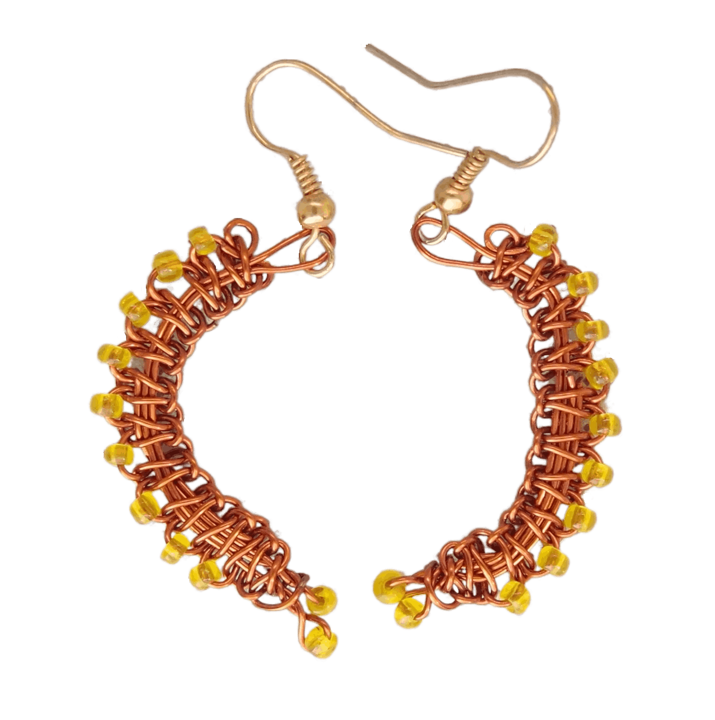 Asymetrické drátkované náušnice se žlutými korálky z měděného drátu, vhodné na zimu