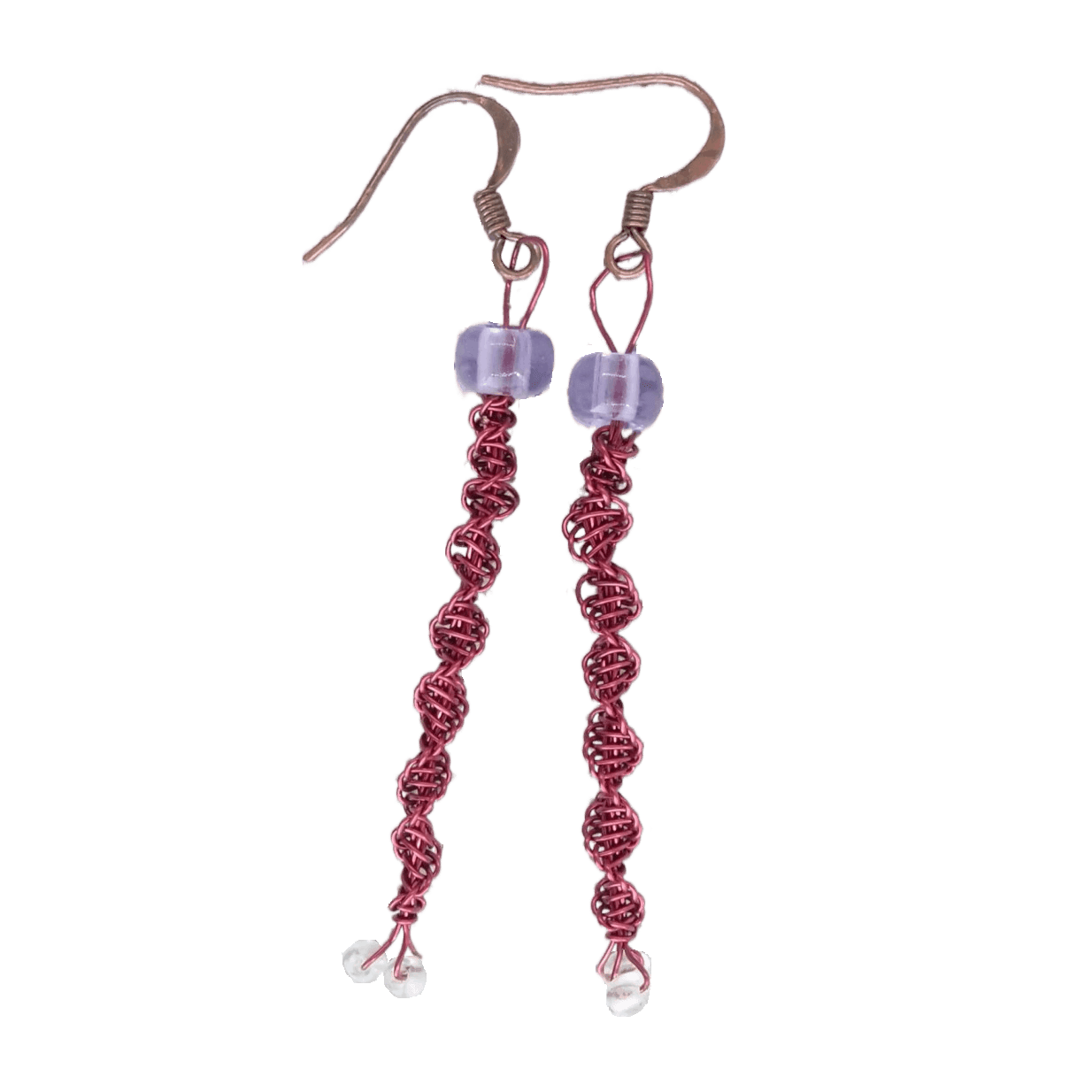Ručně vyráběné náušnice z kvalitního červeného měděného drátku zdobené fialovými korálky. Jejich tvar opticky prodlužuje obličej a barevná kombinace vynikne zejména ve světlých vlasech. Originální šperk, který dodá vašemu outfitu živost a osobitost.