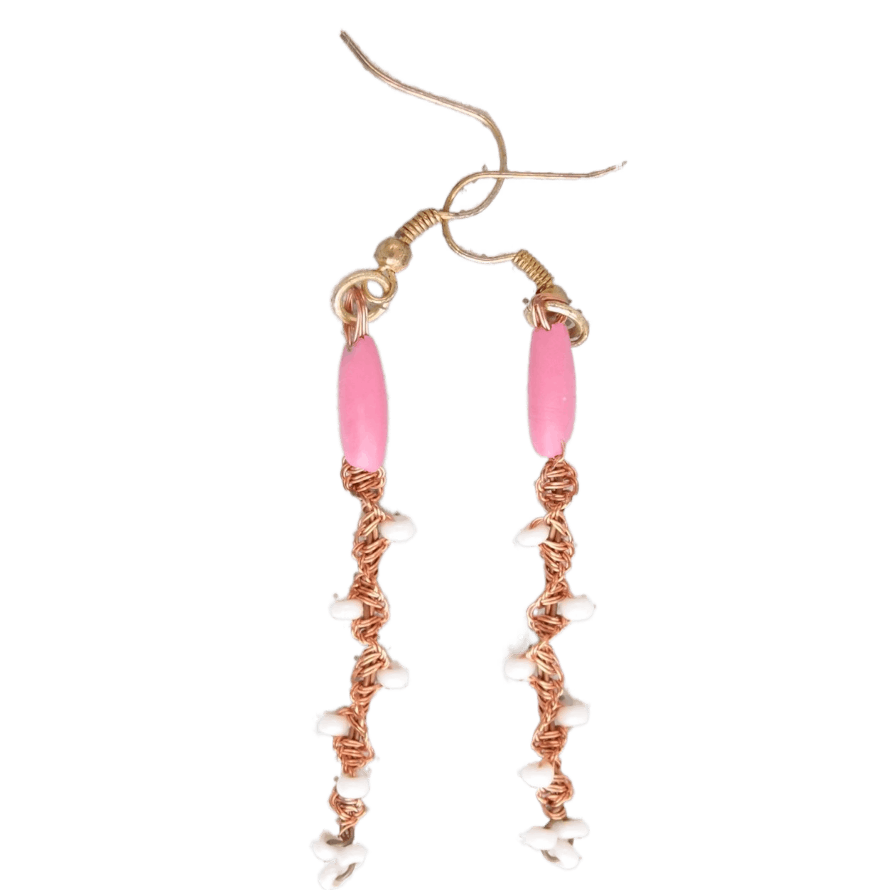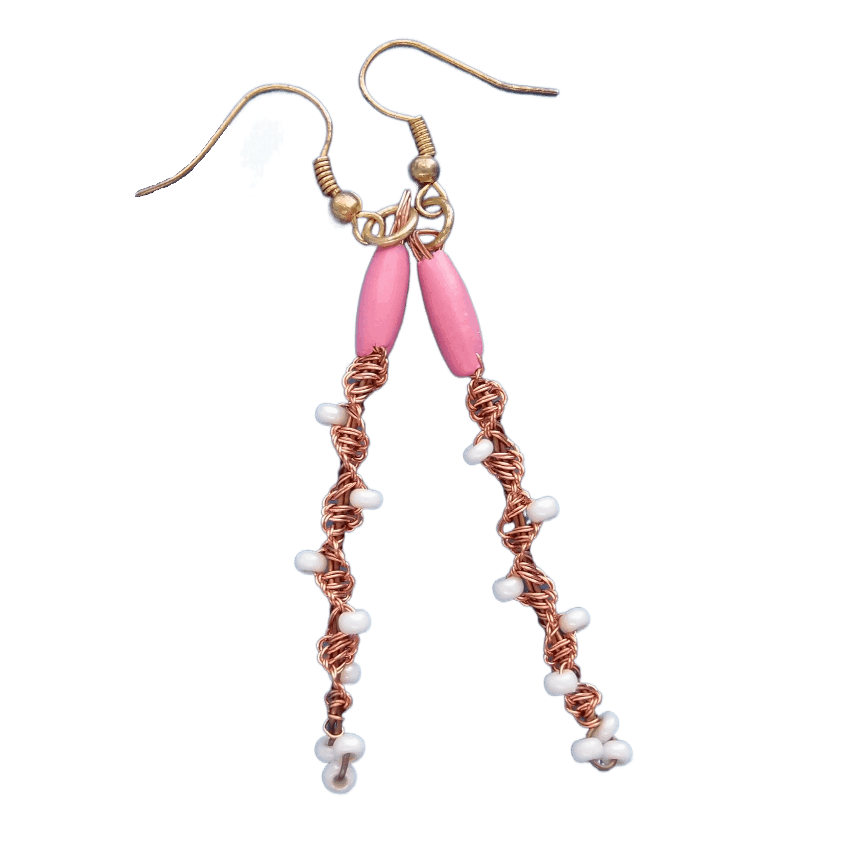 Jemné drátkované náušnice s perleťovými korálky z měděného drátu, romantický styl