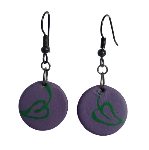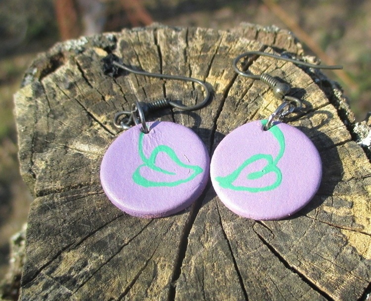 Fialové náušnice z kůže s lístky. Sluší zimnímu typu. Vyniknou v tmavých vlasech. Dolaďte je broží ze stejné soupravy.