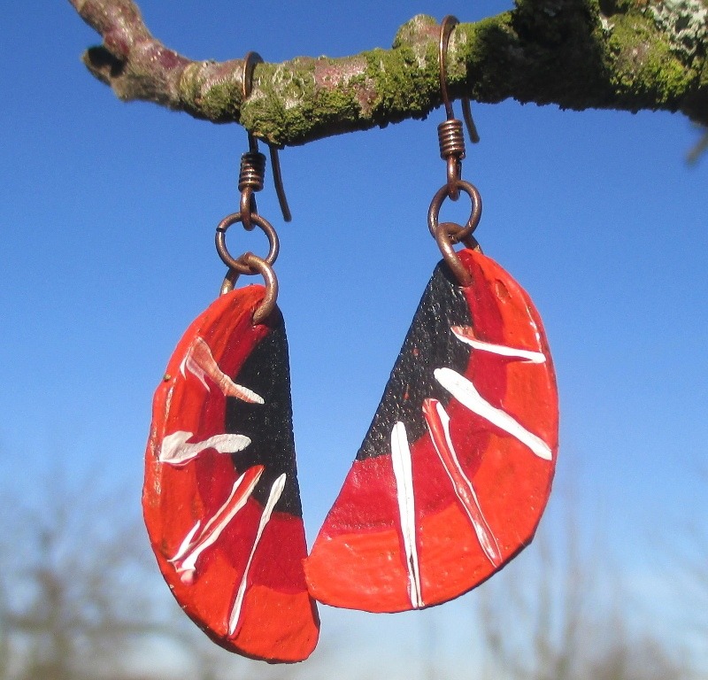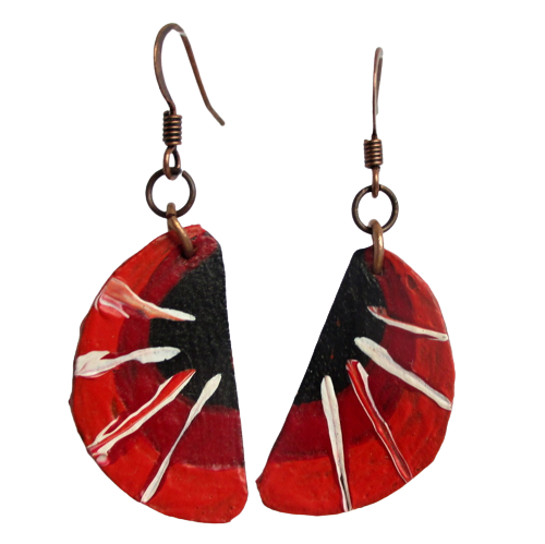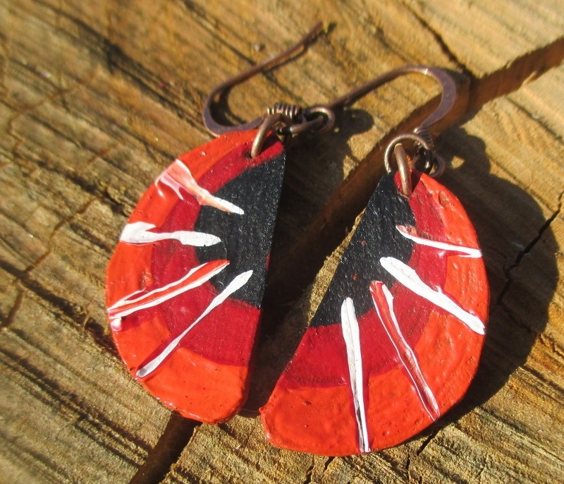 Náušnice z kůže s paprsky. Náušnice půlkruhového tvaru vystřižené z kůže malované černou, oranžovou a červenou akrylovou barvou s bílými paprsky zavěšené na háčcích měděné barvy.