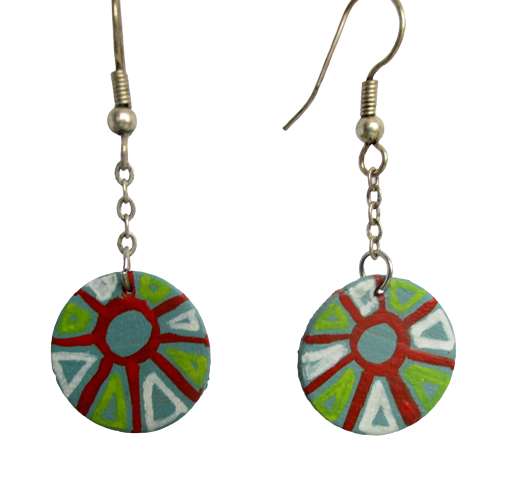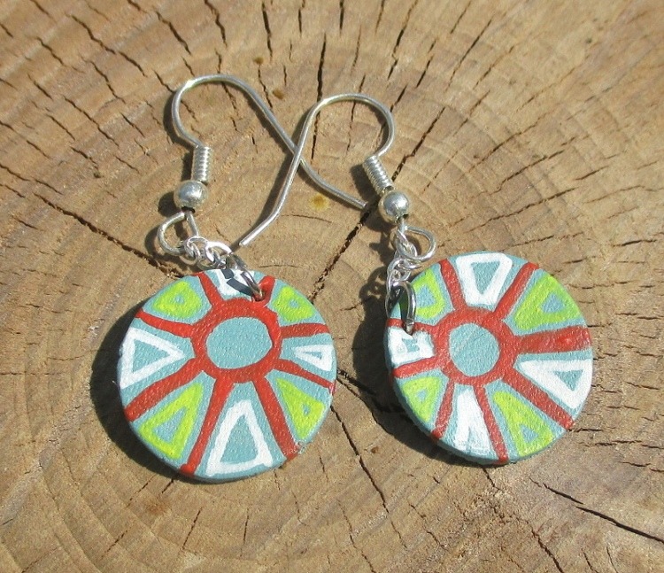 Náušnice se slunečními paprsky. Náušnice kruhového tvaru vystřižené z kůže malované fialové akrylovou barvou s bílou kresbou větviček zavěšené na háčcích stříbrné barvy.