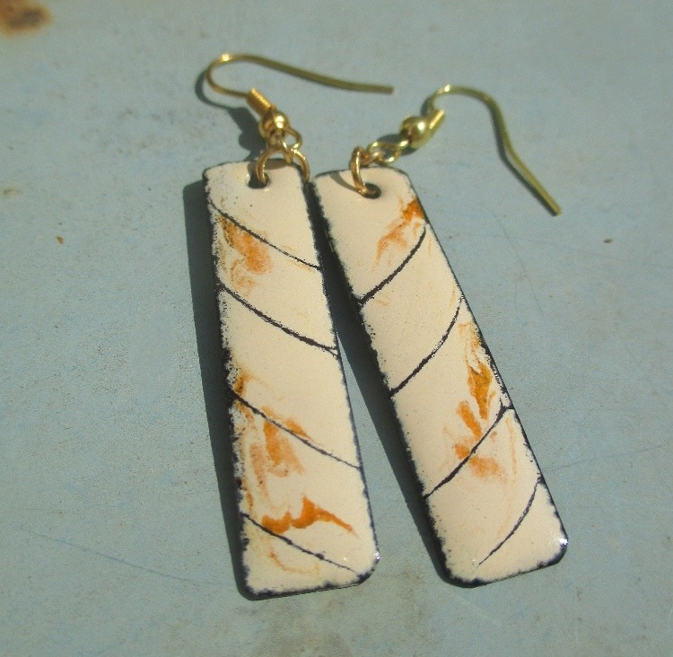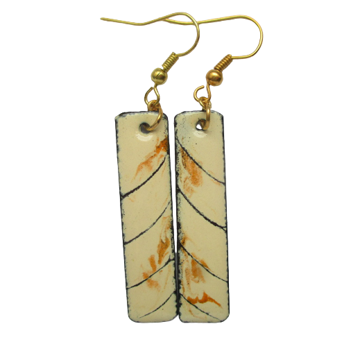 Smaltované mourovaté náušnice. Úzké obdélníkového náušnice s oranžovými flíčky a černými linkami na béžovém podkladu na ručně opracovaných nerezových plíšcích. Zavěšené na háčcích zlaté barvy.