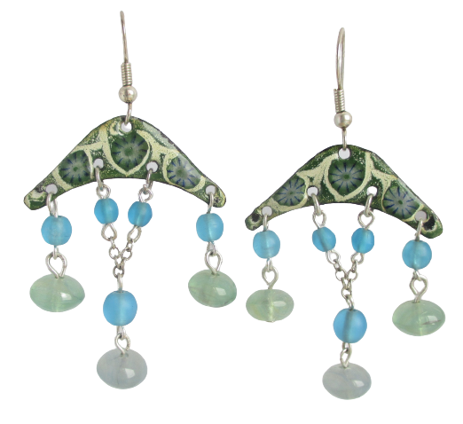 Smaltované náušnice tvaru náušnicového ramínka s jemnou zelenobílou kresbou a doplněné skleněnými korálky modré a zelenkavé barvy, s komponenty ve stříbrné barvě na ručně opracovaných nerezových plíšcích