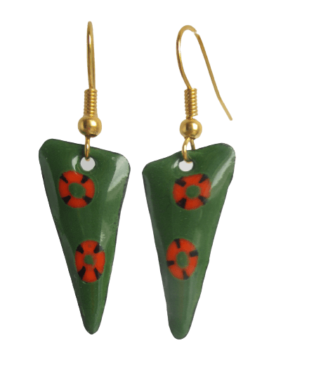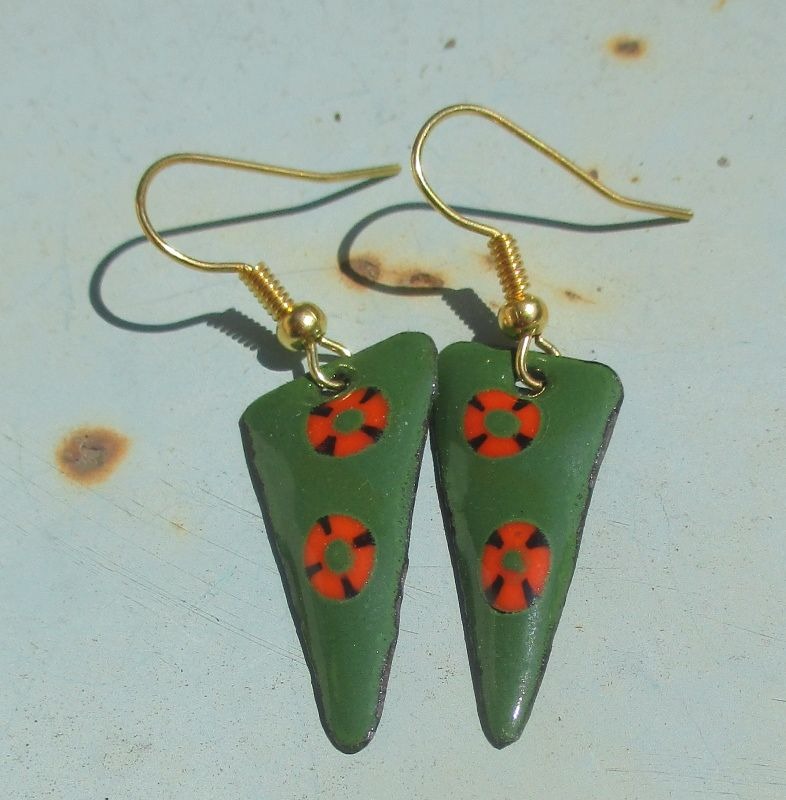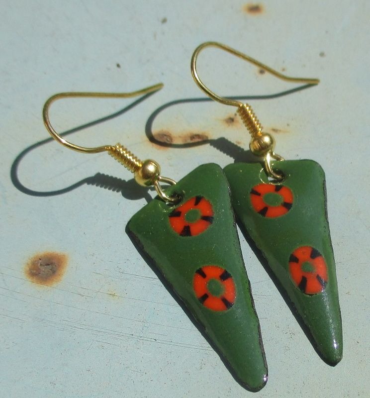 Drobné smaltované tmavě zelené náušnice s květinkami. Jsou malé, mají trojúhelníkový tvar, který sluší různým typům obličeje a hodí se pro každou příležitost. Jsou dobrou volbou pokud si začínáte se smalty nebo vybíráte dárek. Vyniknou především ve světlých vlasech.