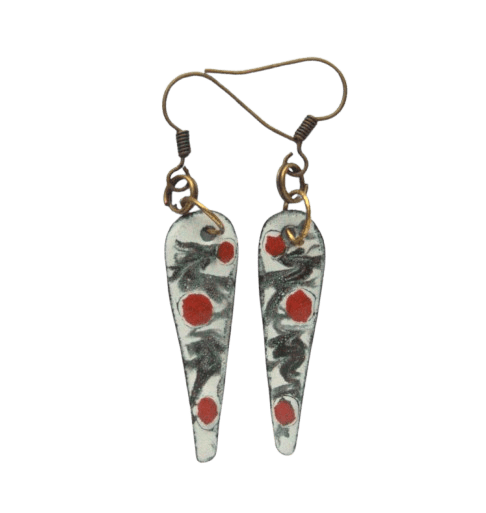 Smaltované náušnice s červenými puntíky. Objevte jemnou eleganci s těmito smaltovanými náušnicemi ve tvaru protáhl obrácené kapky. Tyto menší a štíhlé náušnice jsou ideální pro ženy, které preferují subtilní, ale výrazné šperky. Svým designem opticky prodlužují obličej a perfektně ladí s celkovým vzhledem, který hledá sofistikovaný a minimalistický doplněk. Přidejte k nim i další šperky ze stejné kolekce.