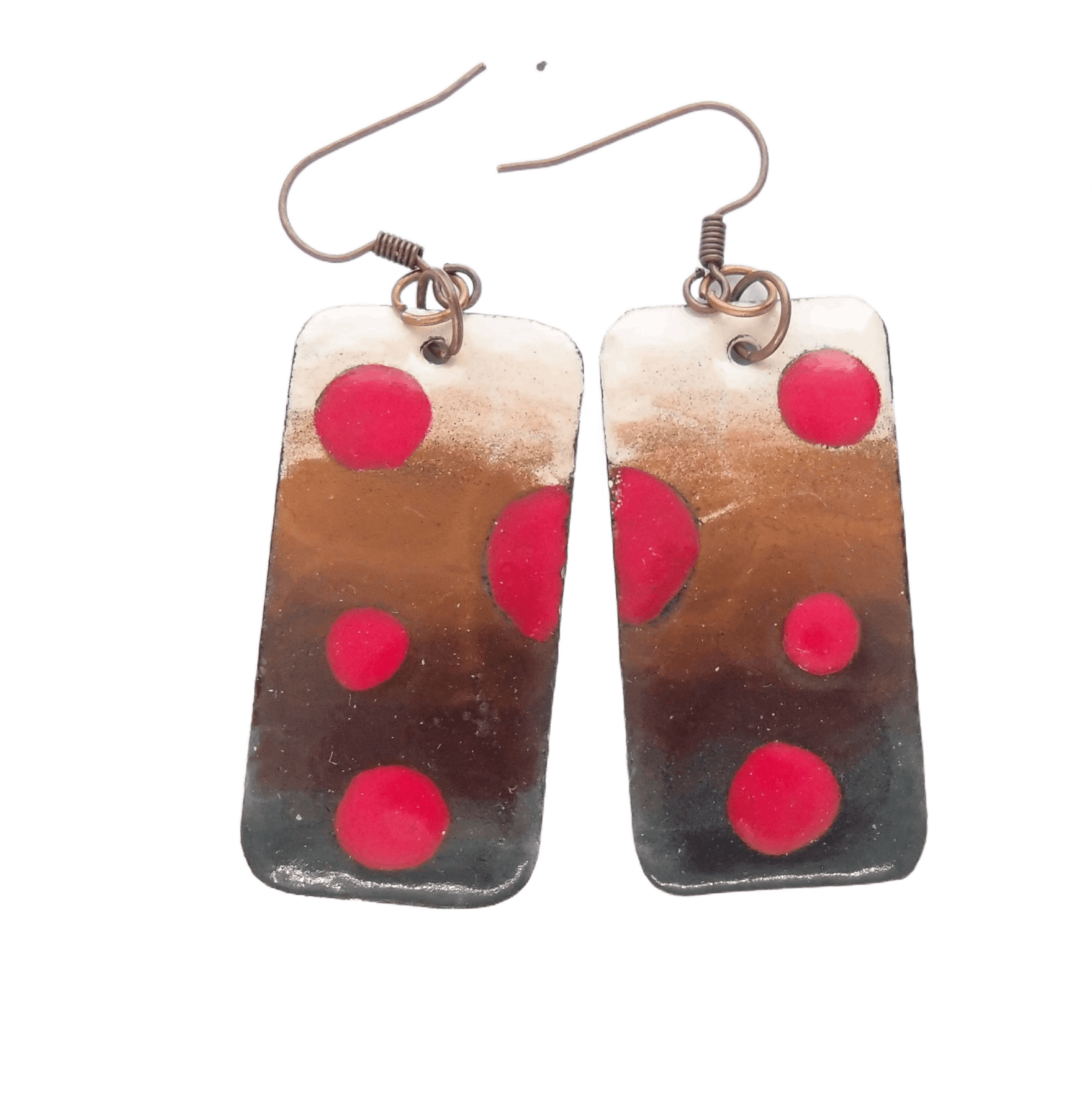 Obdélníkové smaltované náušnice s červenými puntíky v přírodních odstínech, zavěšené na měděných háčcích, ručně zpracované.