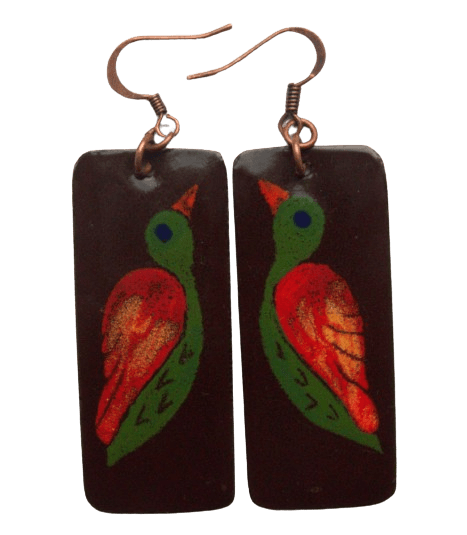 Smaltované náušnice s papoušky. Vyniknou ve světlých vlasech. Pro milovnice velkých náušnic. Doplňte je přívěskem nebo sponkami ve stejných barvách.