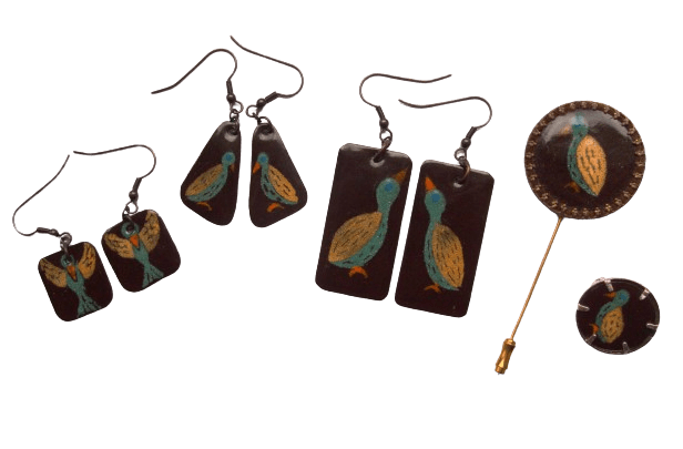 Smaltovaná souprava s ptáčky. Hodí se k romantickým outfitům Pro slavnostní příležitosti se můžete sladit do páru. Sluší podzimnímu typu.