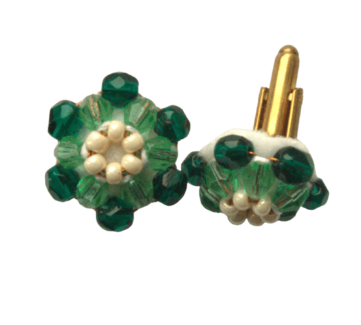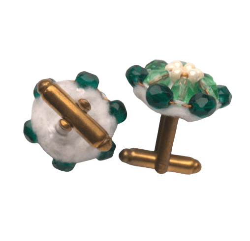 Zelenkavé korálkové manžetové knoflíčky. Hodí se k čistě bílé nebo zelené košili. Doplňte je jehlicí do klopy zve stejných barvách. S vaším dámským doprovodem se můžete sladit pomocí šperků ze stejné soupravy.