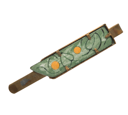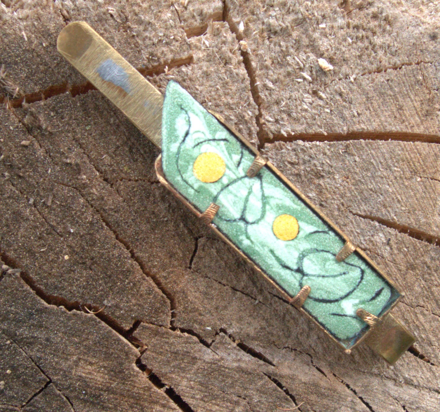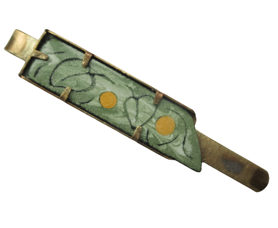 Zelenkavá smaltovaná spona do kravaty. Hodí se pro slavnostní příležitosti. Pro Váš doprovod nabízím brož se stejnou kresbou.