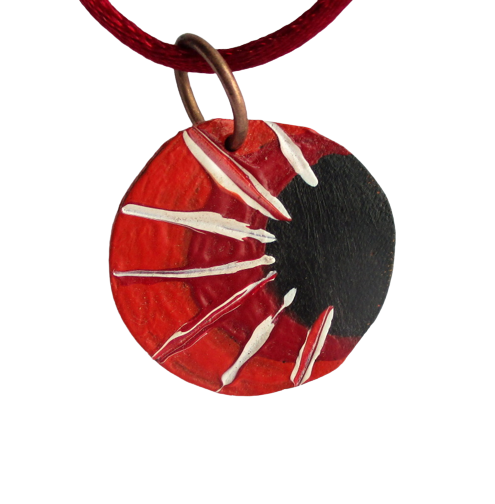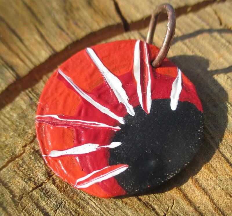 Přívěsek z kůže s bílými paprsky. Přívěsek kruhového tvaru vystřižený z kůže a malovaný černou, červenou a oranžovou akrylovou barvou s bílou kresbou paprsků je zavěšený na bižuterním očku měděné barvy.