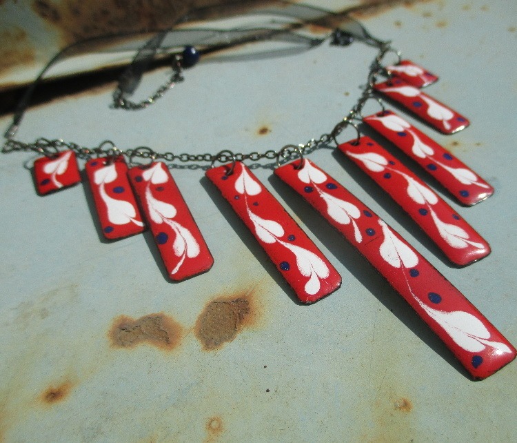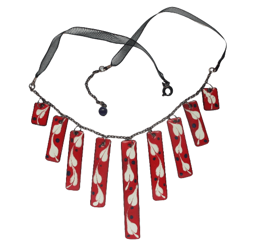 Smaltovaný náhrdelník s lístky. Velký náhrdelník složený z různě dlouhých dílků zavěšených na řetízku je navržený pro slavnostnější příležitosti. Hodí se k jednobarevným šatů či topu. Výrazný šperk můžete doladit menšími smalty v ladící barvě nebo drobnými náušnice z tmavého kovu.