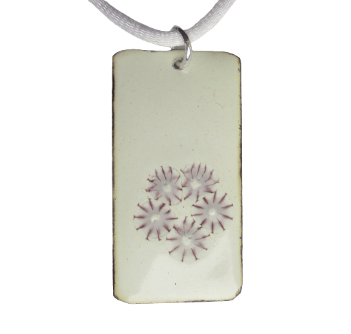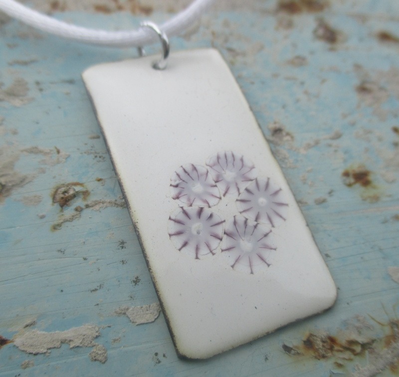 Jemný smaltovaný přívěsek s fialovými květinkami. Úzký delší tvar prodloužíte zavěšením na dlouhé šňůrce.