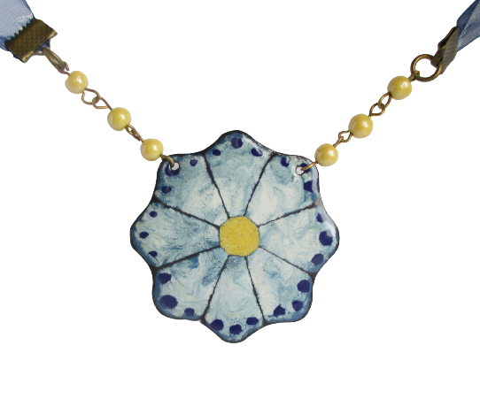 Smaltovaný náhrdelník složený ze smaltovaného modrého květu a skleněných korálků. Sluší romantickému s letnímu rozevlátému stylu. Vynikne také na halence či svetříku tmavé barvy. Náhrdelník je zavěšený na organzových stuhách, jejichž délku můžete uvázáním měnit podle potřeby. Můžete je kombinovat s Vašimi zlatými či mosaznými šperky.