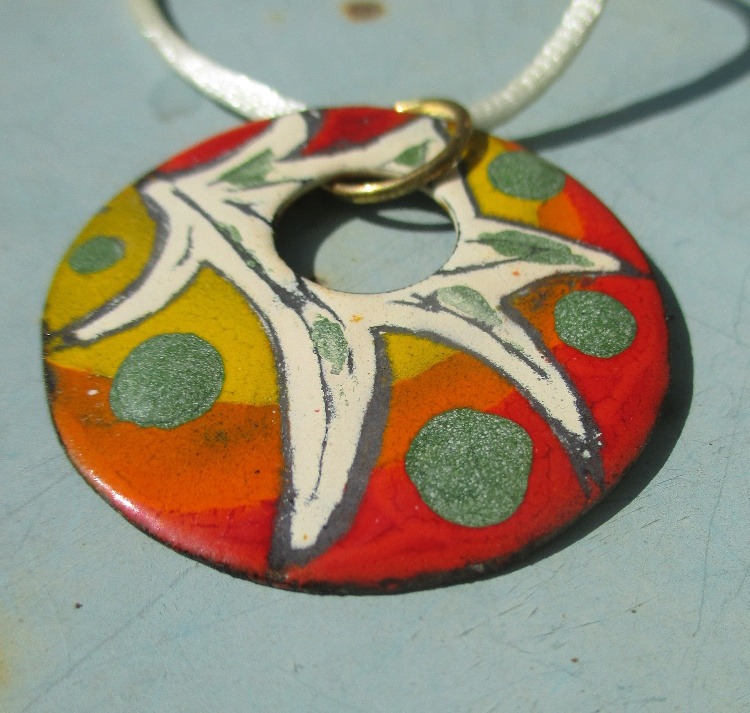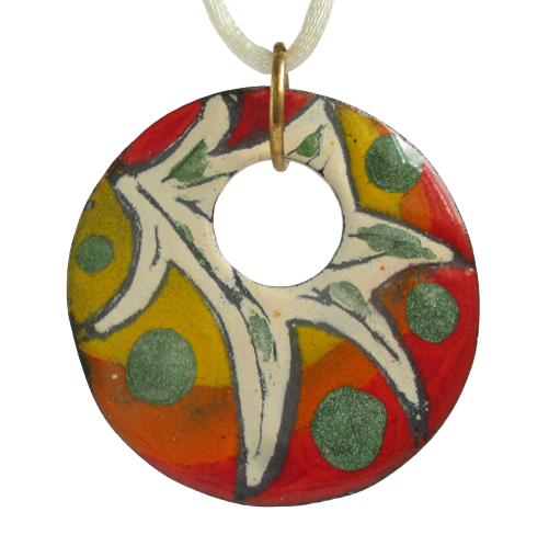 Smaltovaný mexický přívěsek. Přívěsek kruhového tvaru s větším kulatým otvorem s ostrou béžovou kresbou a zelenými puntíky na žlutooranžovočerveném podkladu na ručně opracovaném nerezovém plíšku. Je zavěšený za velké bižuterní očko zlaté barvy.