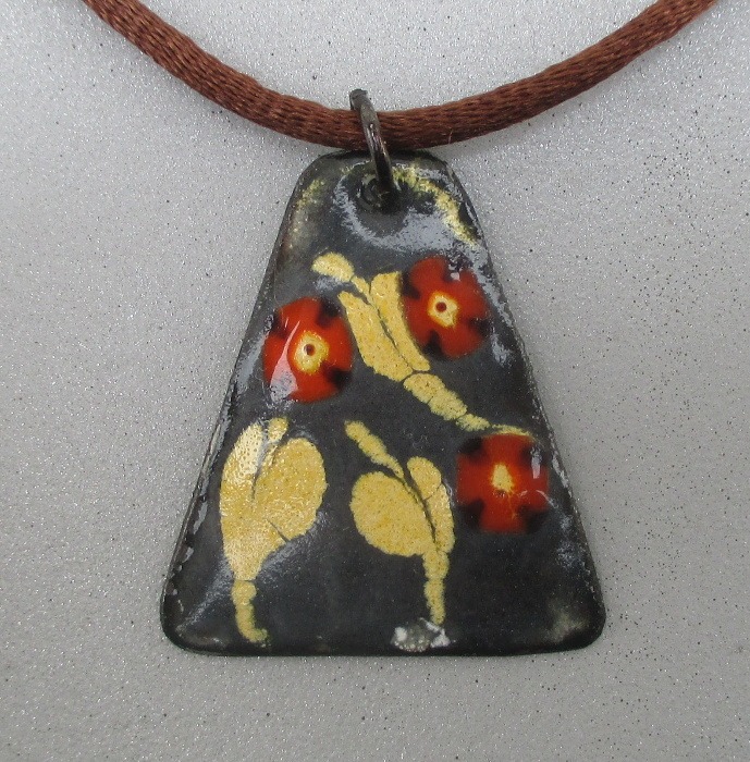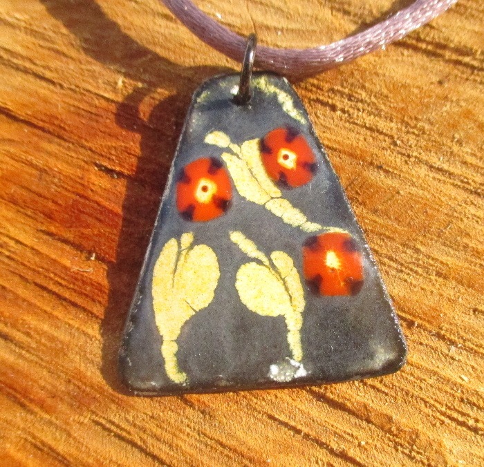 Smaltovaný přívěsek s lístečky. Menší přívěsek se hodí k různým stylům. Výšku uvázání si můžete měnit podle potřeby. Hodí se k pastelovým outfitům. Dodávám jej se saténovou šňůrkou ladící barvy. Můžete jej doplnit náušnicemi a prstenem ve stejných barvách.