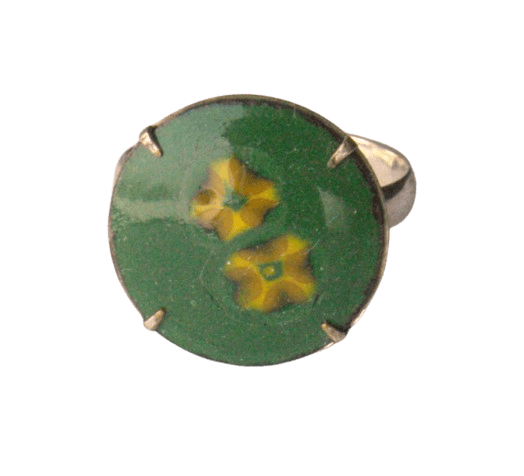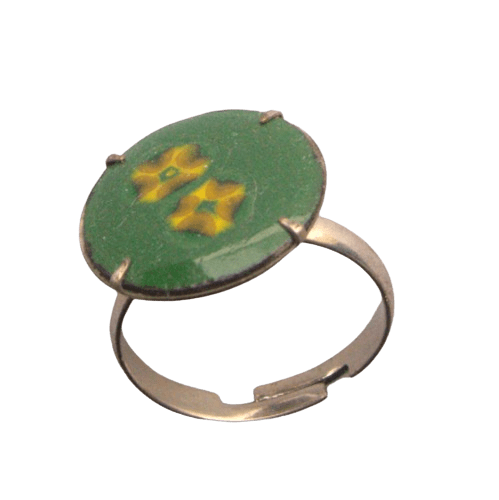 Zelený smaltovaný prsten s květinami. Obroučka je má nastavitelnou velikost. Sluší jarnímu typu