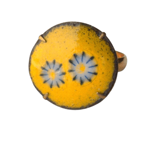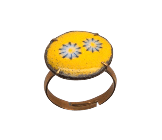 Žlutý smaltovaný prsten. Obroučka je má nastavitelnou velikost. Hodí se k romantickému stylu.