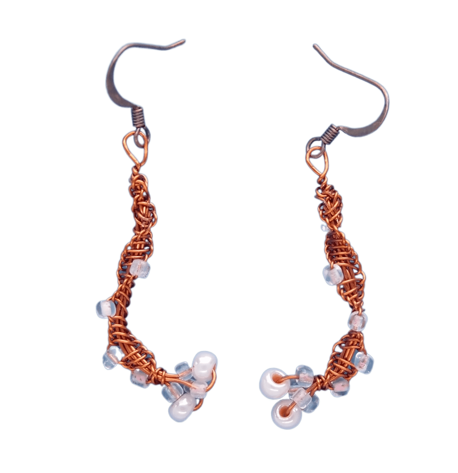 Drátkované náušnice s růžovými korálky v asymetrickém tvaru z měděného drátku.
