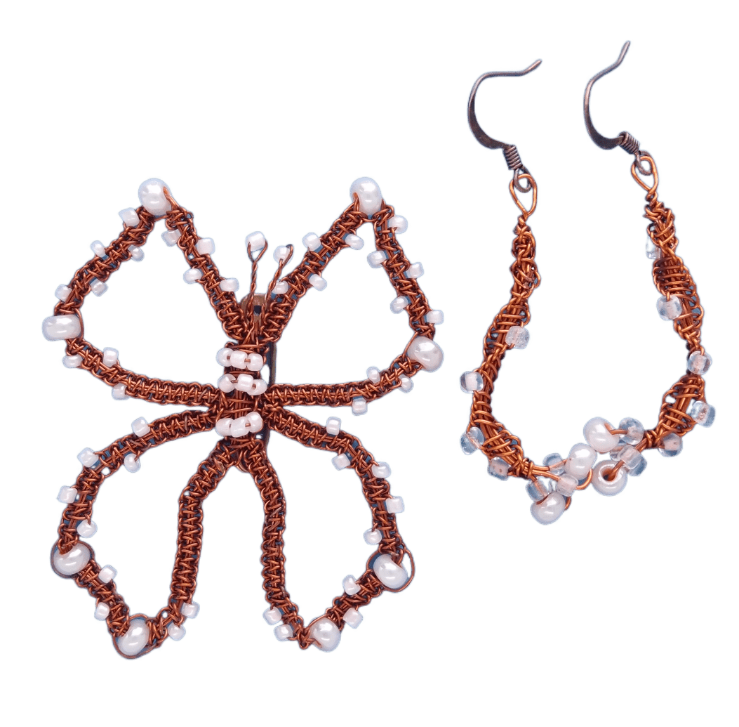 Elegantní set složený z jemně drátkované motýlí brože a asymetrických náušnic, obojí zdobené růžovými skleněnými korálky. Souprava je ručně vyrobená z kvalitního měděného drátku a spojuje originalitu s lehkostí. Hodí se pro každou příležitost, vynikne jak na letní party, tak při slavnostních událostech. Díky romantickému vzhledu a univerzálnímu stylu ji snadno sladíte s různými outfity.
