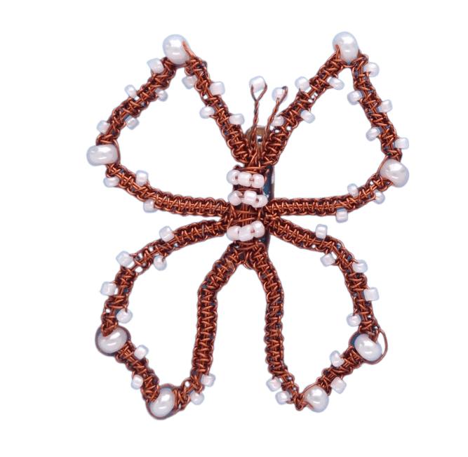 Drátkovaná motýlí brož s růžovými korálky z měděného drátku