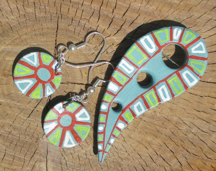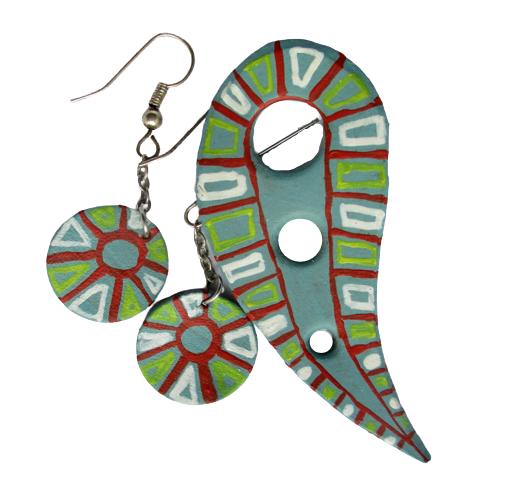 Kožená souprava se slunečními paprsky. Brož vystřižená z kůže ve tvaru kapky s vyraženými kolečky a náušnice kruhového tvaru malované pastelovou světle tyrkysovou akrylovou barvou a červeným, žlutým a bílým ornamentem. Brož je ze spodní strany je podlepená světlemodrou plstí se spínacím špendlíkem stříbrné barvy. Náušnice jsou zavěšené na háčcích stříbrné barvy.