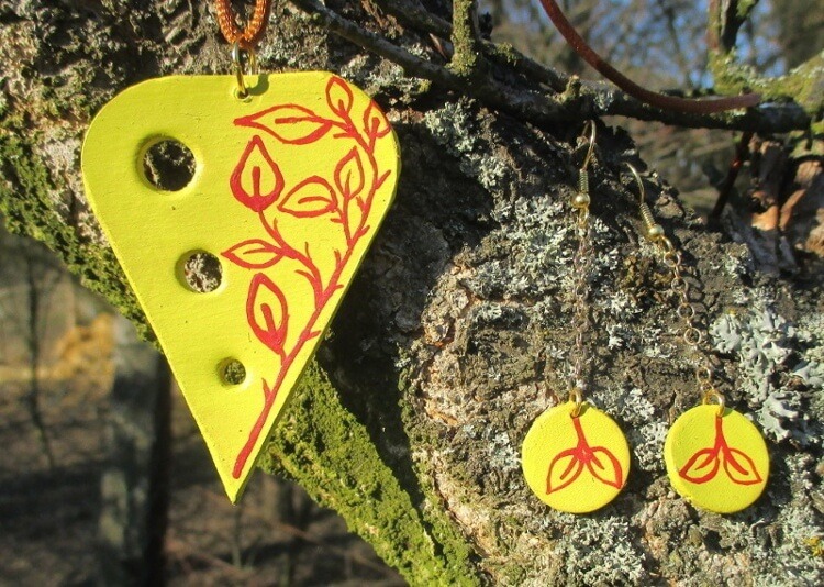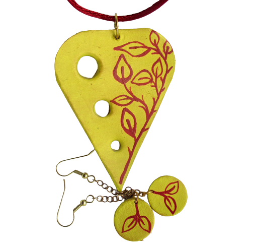 Souprava z kůže s červenými lístky. Přívěsek tvaru písmene V s otvory po jedné straně a kruhové náušnice vystřižené z kůže a malované žlutou akrylovou barvou s červenou kresbou lístečků jsou zavěšené na háčcích a bižuterním očku zlaté barvy.