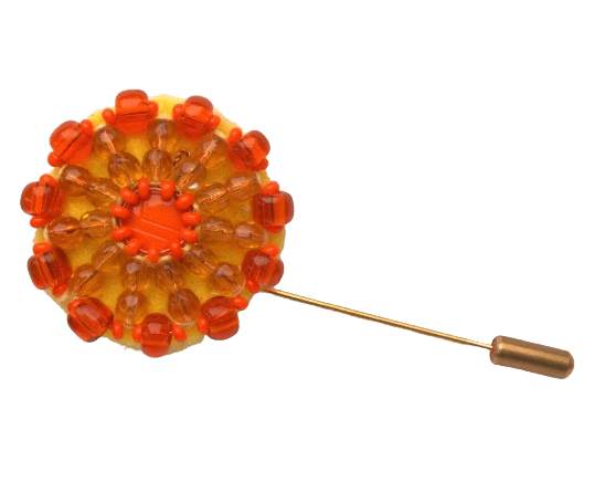 Oranžová korálková jehlice do klopy. Hodí se pro příležitosti, kdy chcete být nepřehlédnutelný. S vaším dámským doprovodem se můžete sladit šperky ze stejné soupravy.