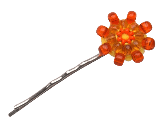 Oranžová korálková sponka. Hodí se jako dárek pro malou slečnu. Pevné perko neklouže z vlasů. Do soupravy si můžete vybrat náušnice, brož nebo náramek ze stejných korálků.