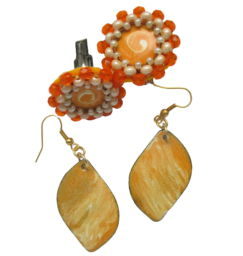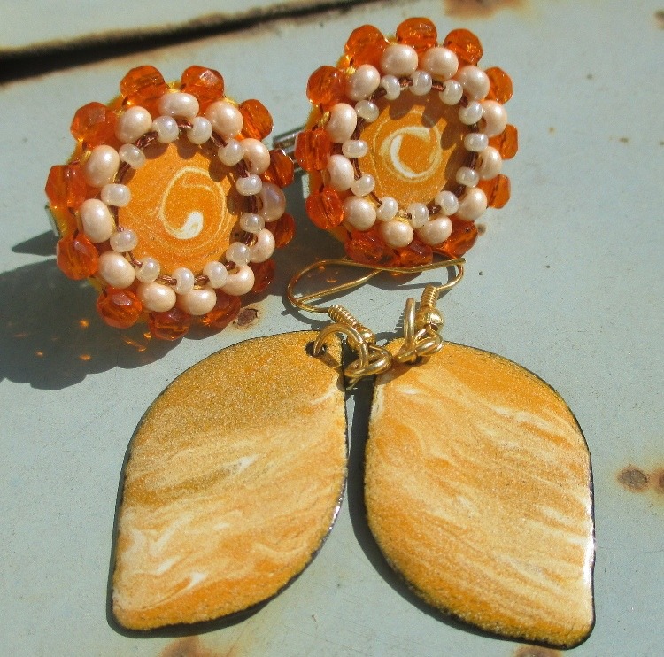 Smaltovaná kočičí souprava. Souprava visacích náušnic a manžetových knoflíčků v krémově zrzavé barvě na ručně opracovaných nerezových plíšcích. Manžetové knoflíky jsou doplněny korálky, komponenty jsou ve zlaté a platinové barvě.