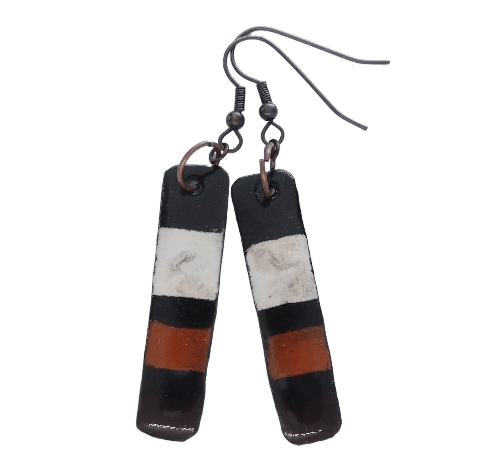 Smaltovaná pruhovaná souprava. Tato souprava, zahrnující smaltované pruhované náušnice, malý přívěsek a pruhovanou jehlici do klopy, je ideálním setem pro pár, který ocení jednoduchý, ale výrazný design. V teplých odstínech, které ladí k sobě, dodává souprava eleganci a harmonii. Náušnice a přívěsek skvěle vyniknou ve světlých vlasech, zatímco pruhovaná jehlice je dokonalým doplňkem pro muže, který hledá sofistikovaný prvek pro klopu saka. Tento set je skvělou volbou pro páry, které si chtějí dopřát stylové a koherentní doplňky pro různé příležitosti.