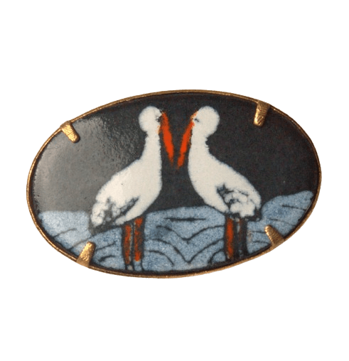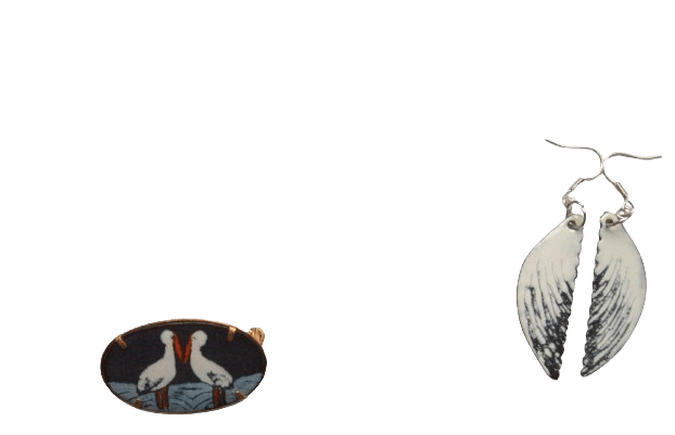 Smaltovaná souprava s čápy. Nepřehlédnutelné šperky vyniknou se hodí pro každou příležitost. Náhrdelník nebo brož můžete kombinovat s náušnicemi v barvě čapích křídel.