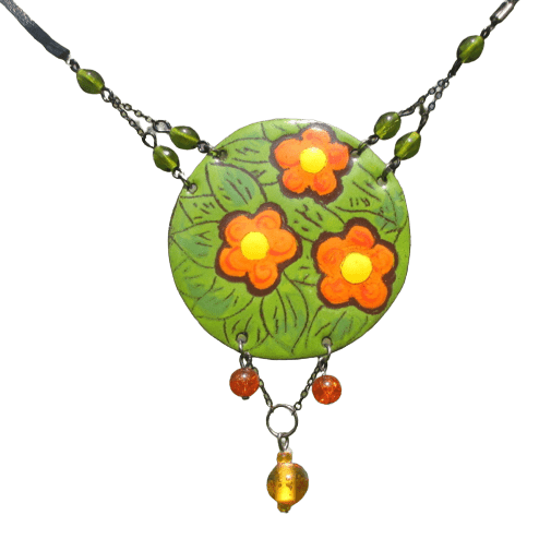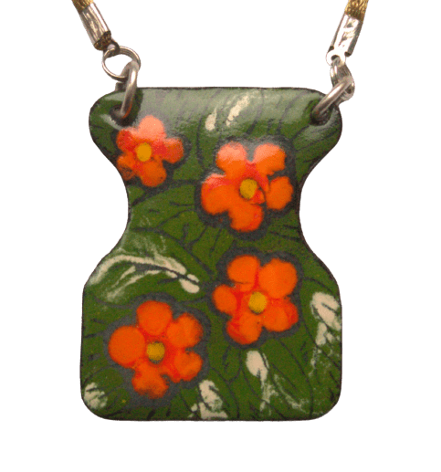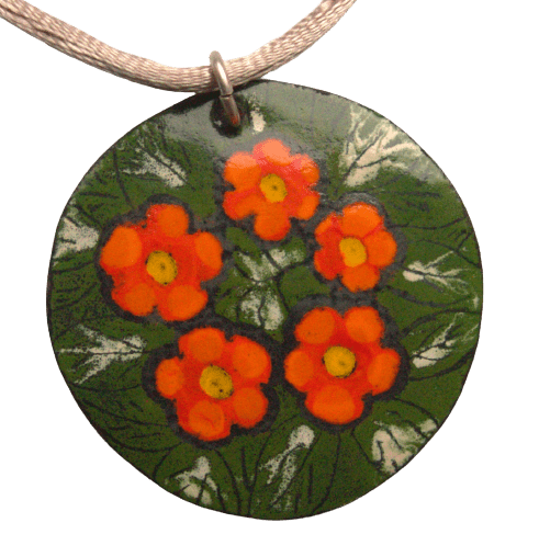 Smaltovaný přívěsek s jarními květy. Vynikne v kombinaci s tmavými šaty nebo halenkou. Dodávám je se saténovou šňůrkou ladící barvy. Výšku zavěšení můžete měnit podle potřeby. Prohlédněte si náušnice ze stejné kolekce.